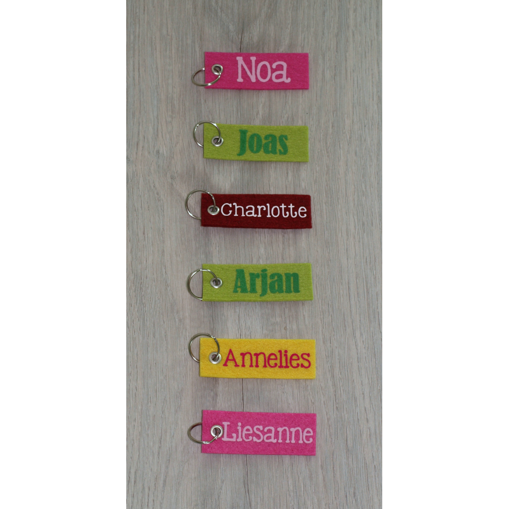 Vrolijke sleutelhanger van dik vilt voor aan je schooltas, etui of sleutelbos. De hanger is 7 cm breed en 2,5 cm hoog. Heb je een wat langere naam?! Dan maken we de sleutelhanger ook gewoon wat langer.
