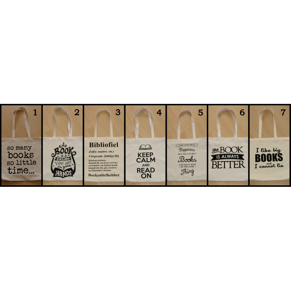 Zo, da's nog eens in stijl naar de bieb gaan, met zo'n toffe boekentas!De tassen zijn ongeveer 48 cm hoog en 43 cm breed, een stukje groter dan een standaard linnen tasje dus. Ze zijn gemaakt van stevige katoen en zijn voorzien van een brede bodem waardoor er nóg meer boeken in passen.