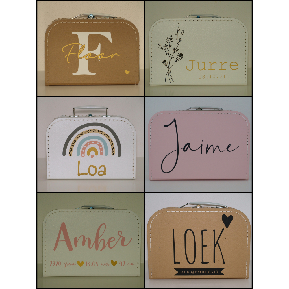 Dat is nog eens een mooi kraamcadeau, een koffertje met daarop de naam van het kindje en een afbeelding naar keuze. Op de foto zijn voorbeelden te zien, maar er is nog veel meer mogelijk, in overleg bedrukken wij het koffertje helemaal naar wens.