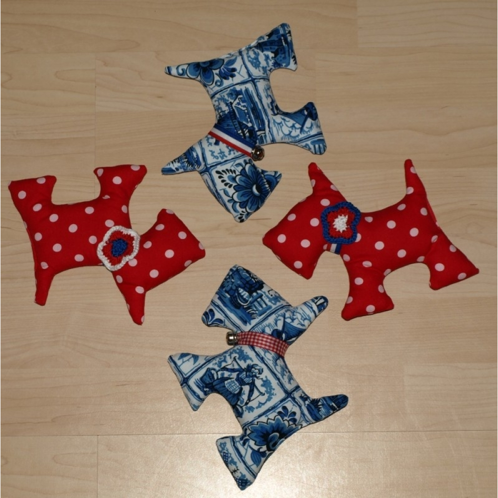 Schattig knuffelhondje, hier uitgevoerd in rood-wit-blauw, maar natuurlijk zijn andere kleuren ook mogelijk.
