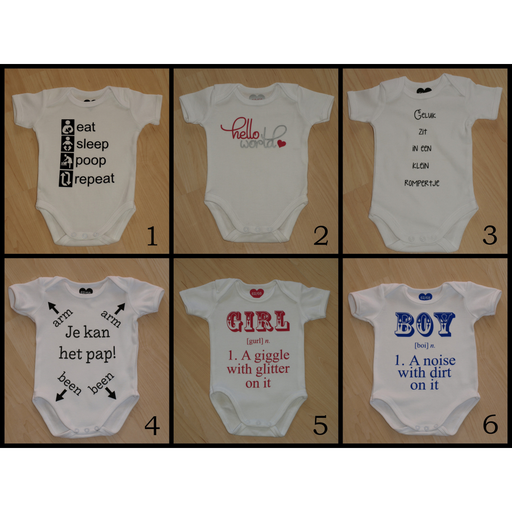 Lief toch, deze rompertjes met leuke opdruk?! Rompertjes 1, 2 en 3 zijn op voorraad in maat 50/56 en rompertjes 4, 5 en 6 in maat 62/68.